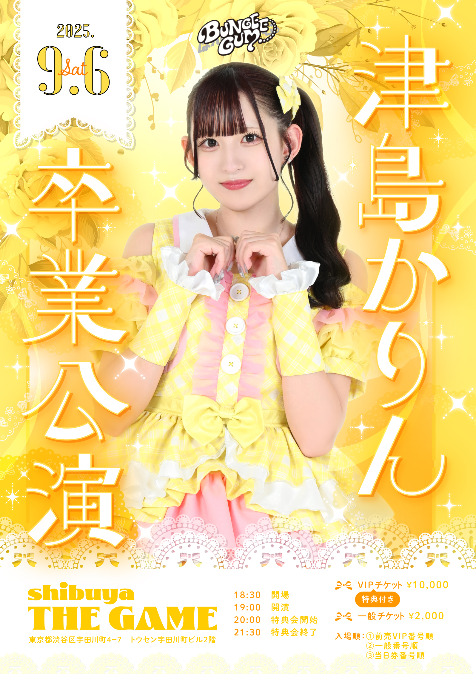 ▼料金:VIPチケット10,000円(津島かりん特典会後挨拶/集合写メ/15秒動画/ファストパス×2) 前方チケット3,500円 一般チケット2,000円 当日券+500円