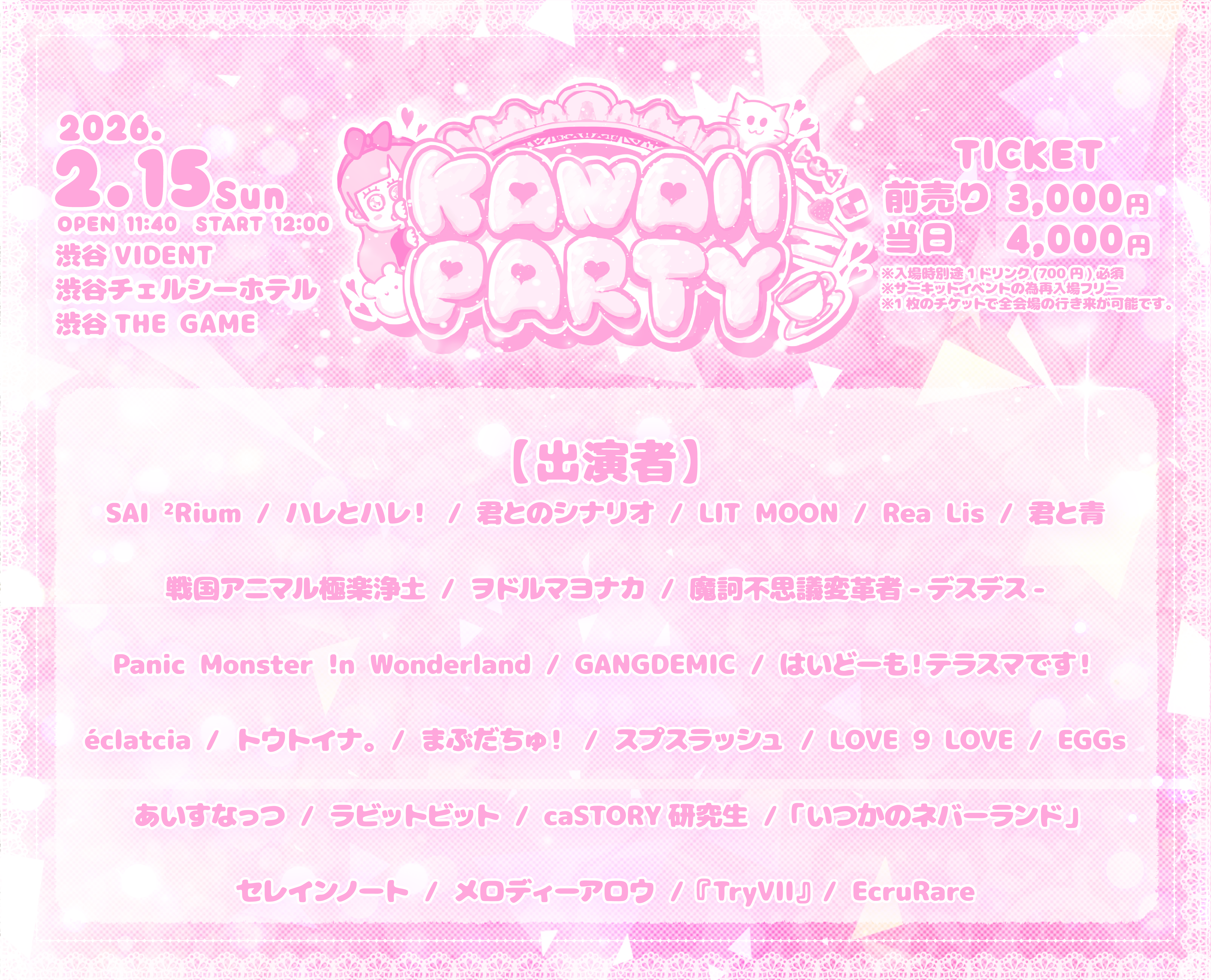 <第9弾出演者>AiliceNoa / AOAO / antares / INOiZe↯ / vVibe! / ΩMG / KAZALIN / Coloration / 可愛いって言わないと呪う! / 新世界ギルドール / SEIEN-星宴- / 天上天使 / 毒彩シンシャ / 翔んでファレノプシス / NeoBiBit / NO FRAME / はくchu♡む / pureran story / FLAPSTAR / BrainBeat / マイナーガール / 真夜中ノスタルジー / 真夜中のメリーゴーランド / ミニスカポリス / Moon Light Lover / MOON RABBiTS / もふる×クロス / 桃色革命 / youmenosay / Lapis / LIZM PALETTE / #ワールドカオス